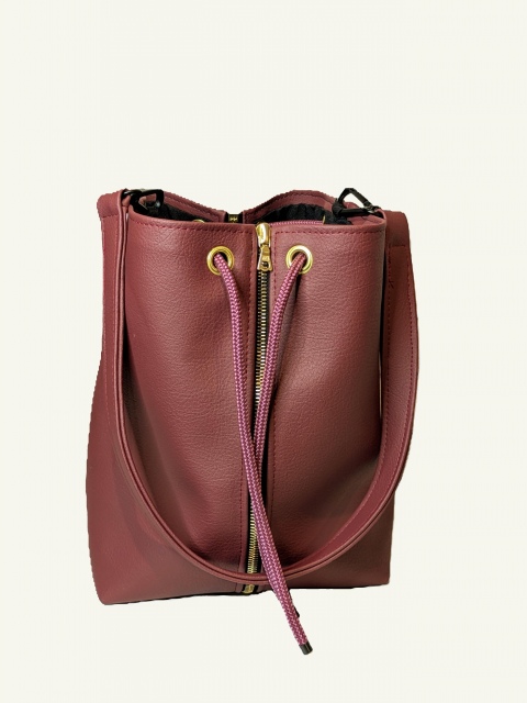 Handgefertigte Handtasche aus beerefarbenem, veganem Bio-Kunstleder mit goldigem Reissverschluss und goldigen Ösen