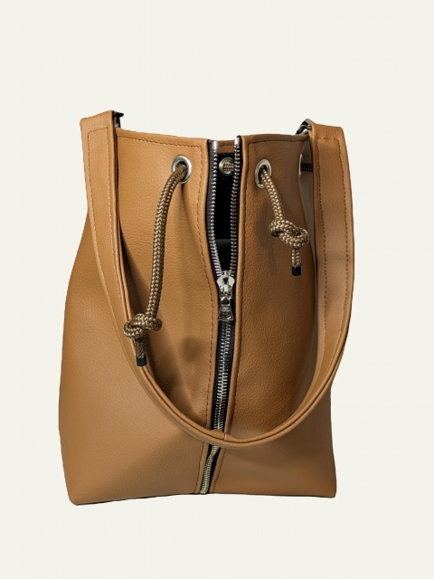 Handgefertigte Handtasche aus braunem, veganem Bio-Kunstleder mit silbrigem Reissverschluss und silbrigen Ösen