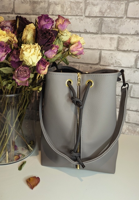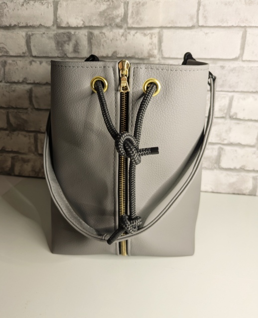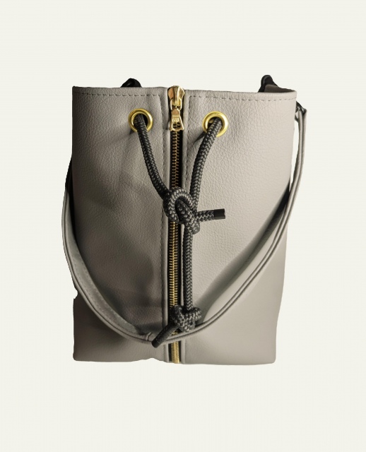 Handgefertigte Handtasche aus grauem, veganem Bio-Kunstleder mit goldigem Reissverschluss und goldigen Ösen