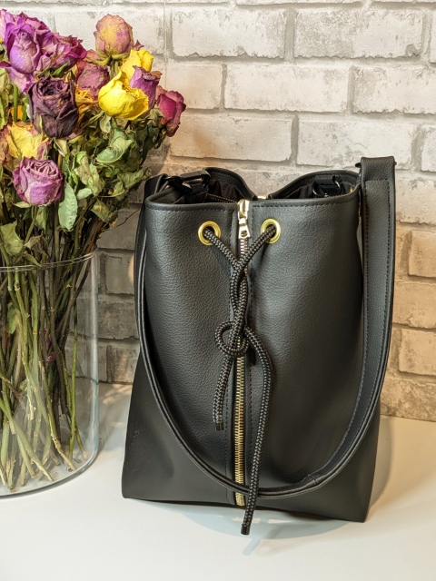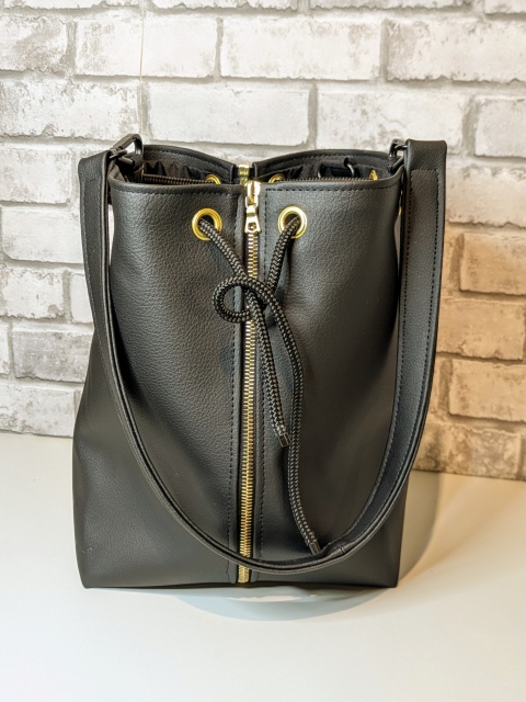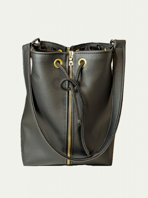 Handgefertigte Handtasche aus schwarzem, veganem Bio-Kunstleder mit goldigem Reissverschluss und goldigen Ösen
