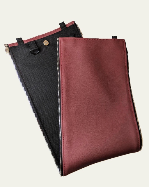 Handgemachtes Mittelteil aus bordeauxenem, veganem Bio-Kunstleber mit silbrigen Reissverschlüssen