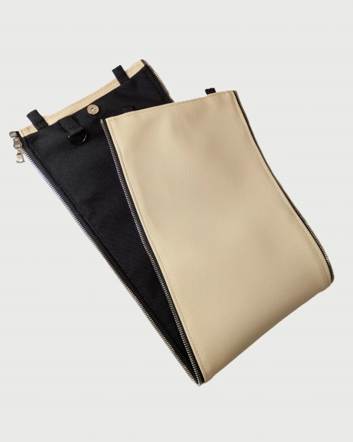 Handgemachtes Mittelteil aus beigem, veganem Bio-Kunstleber mit silbrigen Reissverschlüssen