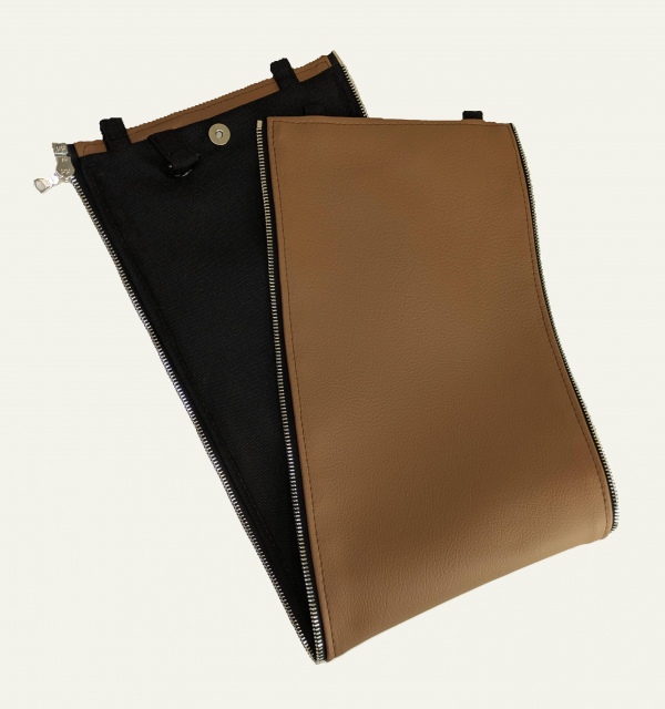 Handgemachtes Mittelteil aus braunem, veganem Bio-Kunstleber mit silbrigen Reissverschlüssen