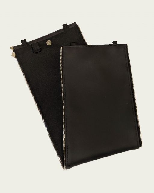 Handgemachtes Mittelteil aus schwarzem, veganem Bio-Kunstleber mit silbrigen Reissverschlüssen