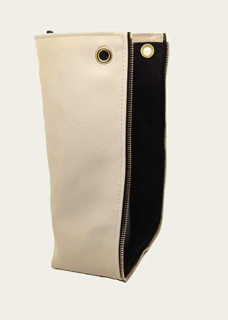 Handgemachtes Taschen-Seitenteil aus beigem, veganem Bio-Kunstleder mit goldigem Reissverschluss und goldigen Ösen