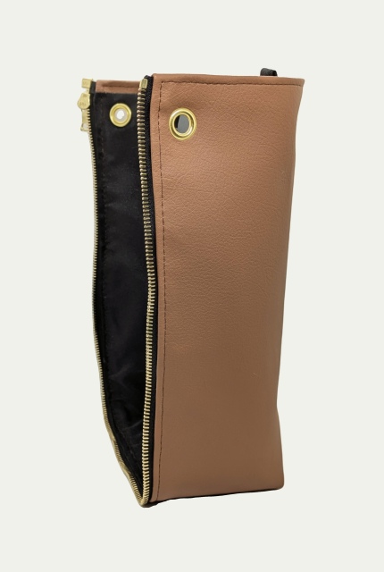 Handgemachtes Taschen-Seitenteil aus braunem, veganem Bio-Kunstleder mit goldigem Reissverschluss und goldenen Ösen