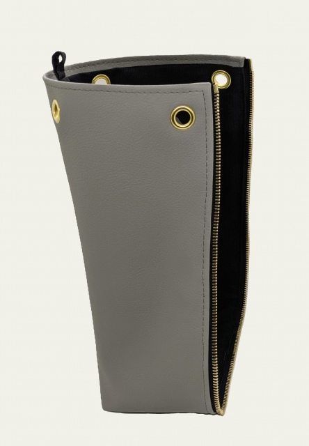 Handgemachtes Taschen-Seitenteil aus grauem, veganem Bio-Kunstleder mit goldigem Reissverschluss und goldigen Ösen