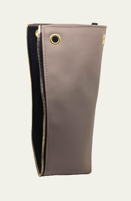 Handgemachtes Taschen-Seitenteil aus moccafarbenem, veganem Bio-Kunstleder mit goldigem Reissverschluss und goldigen Ösen
