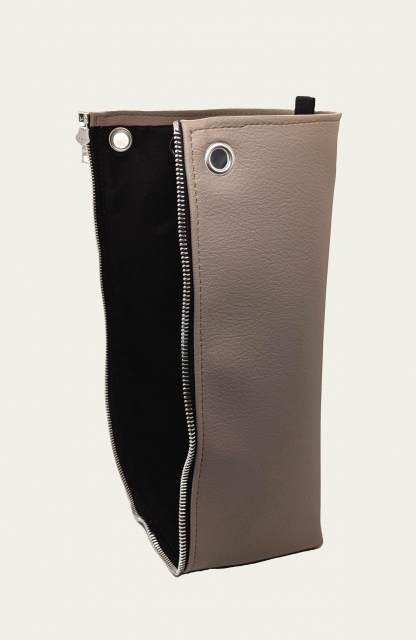 Handgemachtes Taschen-Seitenteil aus moccafarbenem, veganem Bio-Kunstleder mit silbrigem Reissverschluss und silbrigen Ösen