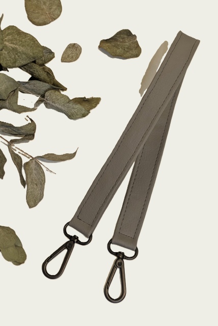 Handgemachter Taschenhenkel aus grauem, veganem Bio-Kunstleder mit schwarzen Karabinern