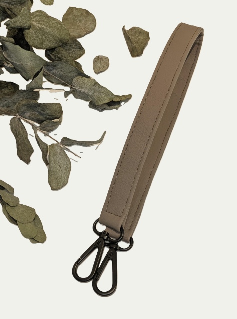 Handgemachter Taschenhenkel aus mocca farbenem, veganem Bio-Kunstleder mit schwarzen Karabinern