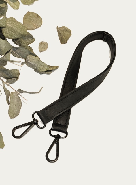Handgemachter Taschenhenkel aus schwarzem, veganem Bio-Kunstleder mit schwarzen Karabinern